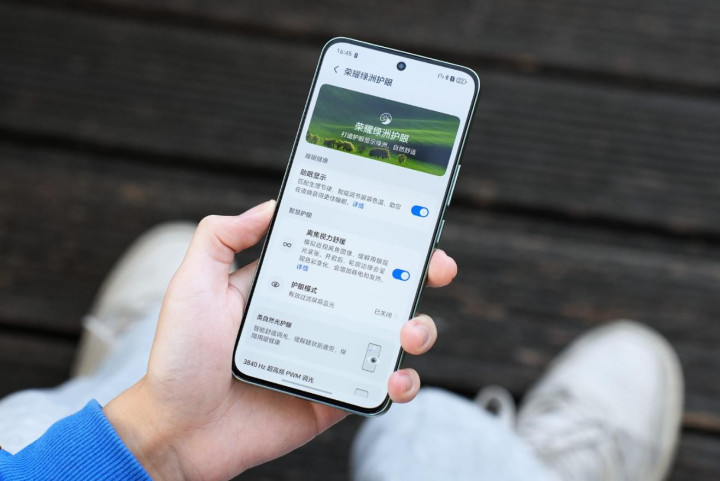 护眼这一块也不错,荣耀的手机护眼性都很强,这款手机正面是一块6.7英寸护眼直屏,有3840Hz高频PWM调光、硬件级低蓝光、类自然光护眼,还支持360°全场景晕动舒缓显示,各种场景下看屏幕都很舒适,屏幕支持1.5k分辨率、120Hz刷新率、4000尼特局部峰值亮度,有高清、高亮和丝滑的显示效果。