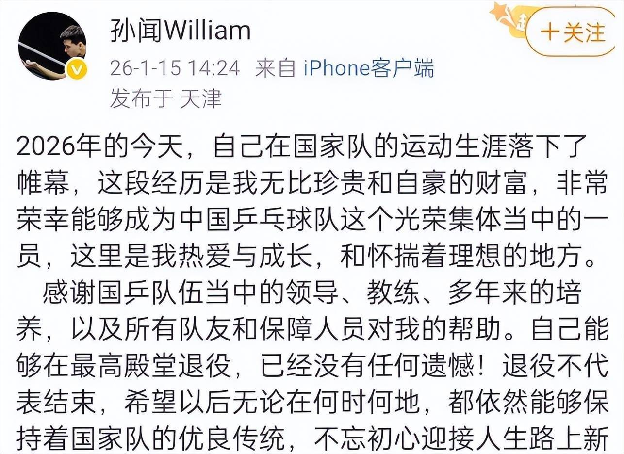 曾经4-0击败张本智和的孙闻也说自己“在最高殿堂退役没有遗憾”。