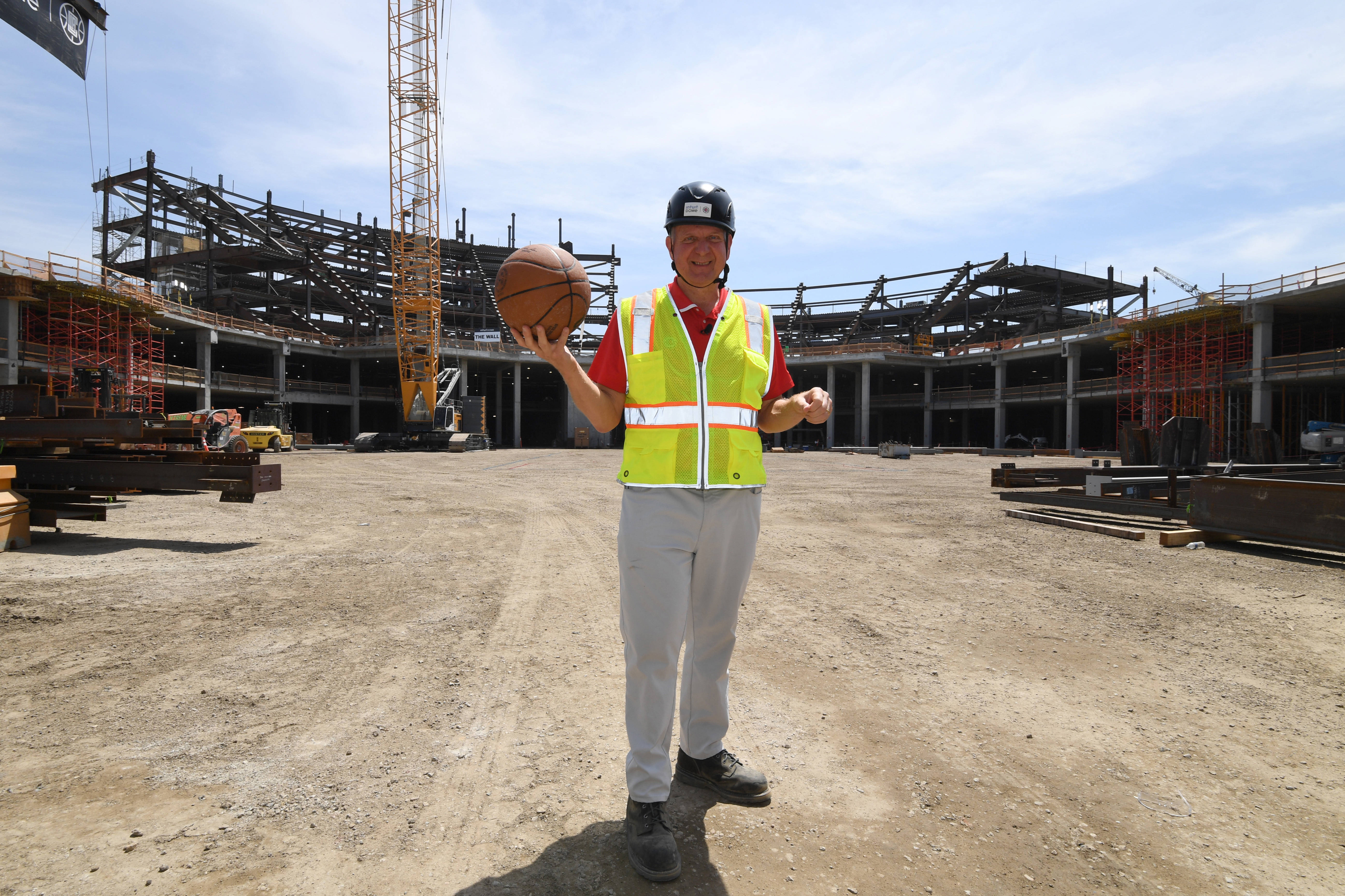 2022年8月的一天,史蒂夫-鲍尔默头戴黑色建筑安全帽,身穿黄色安全背心,站在工地上的装卸站台区域。当时球馆区域的土地还不太平坦,但他完全清楚这里的相关布局,甚至可以准确指出客队更衣室未来的位置。