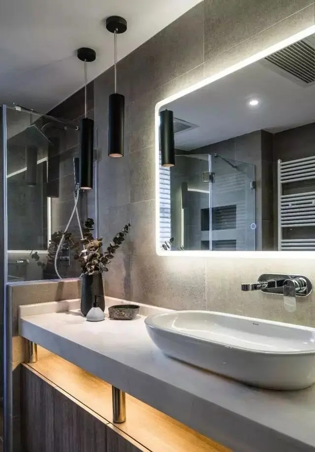 若缺乏自然采光,可通过人为增加灯光布局来补充光源。除主灯外,浴室柜安装镜前灯可使空间更明亮。卫生间灯具宜选防雾灯,密封性好,不惧水雾侵蚀。除卫生间顶灯外,浴室镜柜可增加镜前灯,浴室柜两侧添加壁灯,壁龛等暗处也可设置灯带。