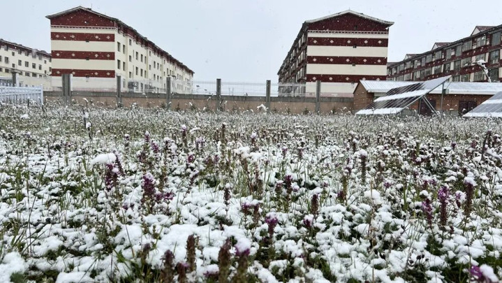 这个时节西北高海拔地区出现降雪并非罕见。图为8月29日,青海果洛州甘德地区出现雨夹雪天气,高海拔地区出现明显积雪,气温持续走低。(图/王晓蓉)